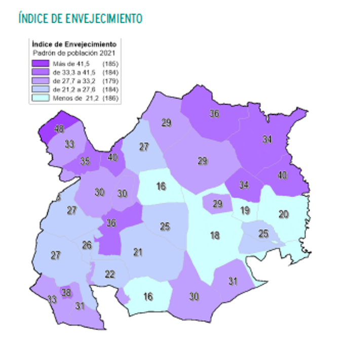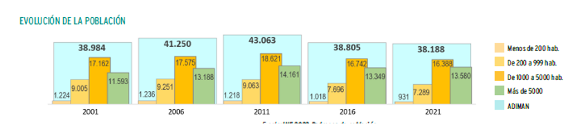 En lo que se refiere al grado de envejecimiento de la población de los municipios de ADIMAN, éstos presentan un índice medio del 21,6, frente al 22,9 de la provincia de Cuenca o el 19,2 del conjunto de la Comunidad. Así la distribución de sus niveles más altos de envejecimiento tiende a situarse entre los municipios de la Serranía, mientras que los índices más bajos se encuentran en los municipios de Montilla del Palancar y Quintanar del Rey con un 16, o Iniesta con un 18.