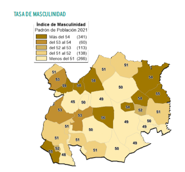 El carácter rural de buena parte de la Comarca de la Manchuela Alta Conquense sitúa la media de la Comarca en un 51, ligeramente por encima del 50,2 provincial y el 50,1 autonómico. En el caso de los municipios de ADIMAN, solo 4 municipios se sitúan con un nivel de masculinidad por debajo de 50; Casas de Benítez con índice de 48, seguidos por el resto; Iniesta, Leda, Motilla del Palancar y Villarta, con 49, en tanto que el resto de los 29 municipios presentan ratios por encima de 50.