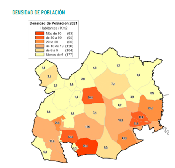 En lo que se refiere a las densidades de población, su distribución geográfica tiene en cuenta la orografía al situar en las zonas de llanura del área sur de la Comarca los municipios más densamente poblados. Así, excepto Motilla del Palancar, que se sitúa en el área central con 80 Hab./ Km², el resto de los municipios más densamente poblados se sitúa en la periferia sur de ADIMAN, destacando entre ellos a Quintanar del Rey con 95 Hab./Km².